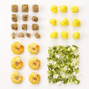 当初、カップヌードルの具材は乾物が試されましたが、湯を注いでから3分以内に元に戻るのが難しく、フリーズドライ製法が採用されました。日本向けの製品では、エビ、ネギ、卵、味付豚ミンチ(通称「謎肉」)が定番の具材として使われています。エビが採用された理由は、豪華さを感じさせる食材として適していたからです。当時の日本にはほとんど輸入されていなかったインド洋産の高級エビ「プーバラン」がフリーズドライ化され、採用されました。